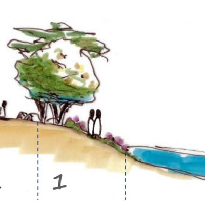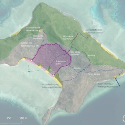 L’aménagement de l’îlot M’Tsamboro vise à créer un ponton pour permettre aux embarcations d’accoster de manière sécurisée et sans perturber le milieu naturel. En complément, notre équipe travail à la valorisation paysagère de l’îlot, fortement fréquenté à des fins de loisirs. Il s’agit ainsi de définir les espaces pouvant être pratiqués de ceux à préserver pour leurs intérêts écologiques et paysagers ; des cheminements et une signalétique sont alors conçus. Par endroit des points d’arrêt permettent de contempler le grand paysage et notamment l’horizon marin ou les vues sur Grande terre. Un mirador est prévu à un des points le plus hauts de l’îlot. Enfin, le projet prévoit de mettre en valeur les espaces cultivés de l’îlot et de bien les identifier pour qu’ils soient préservés par rapport aux autres usages.
