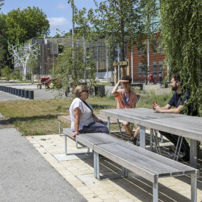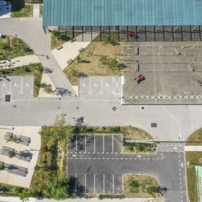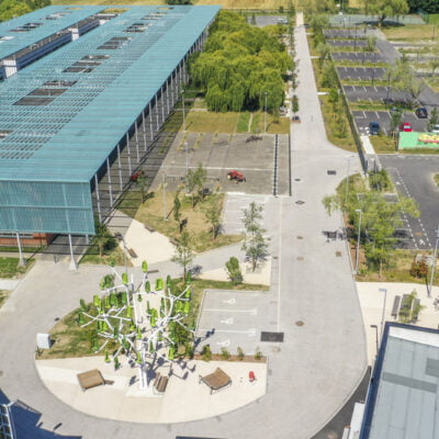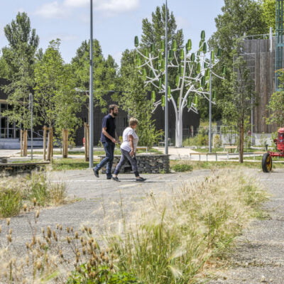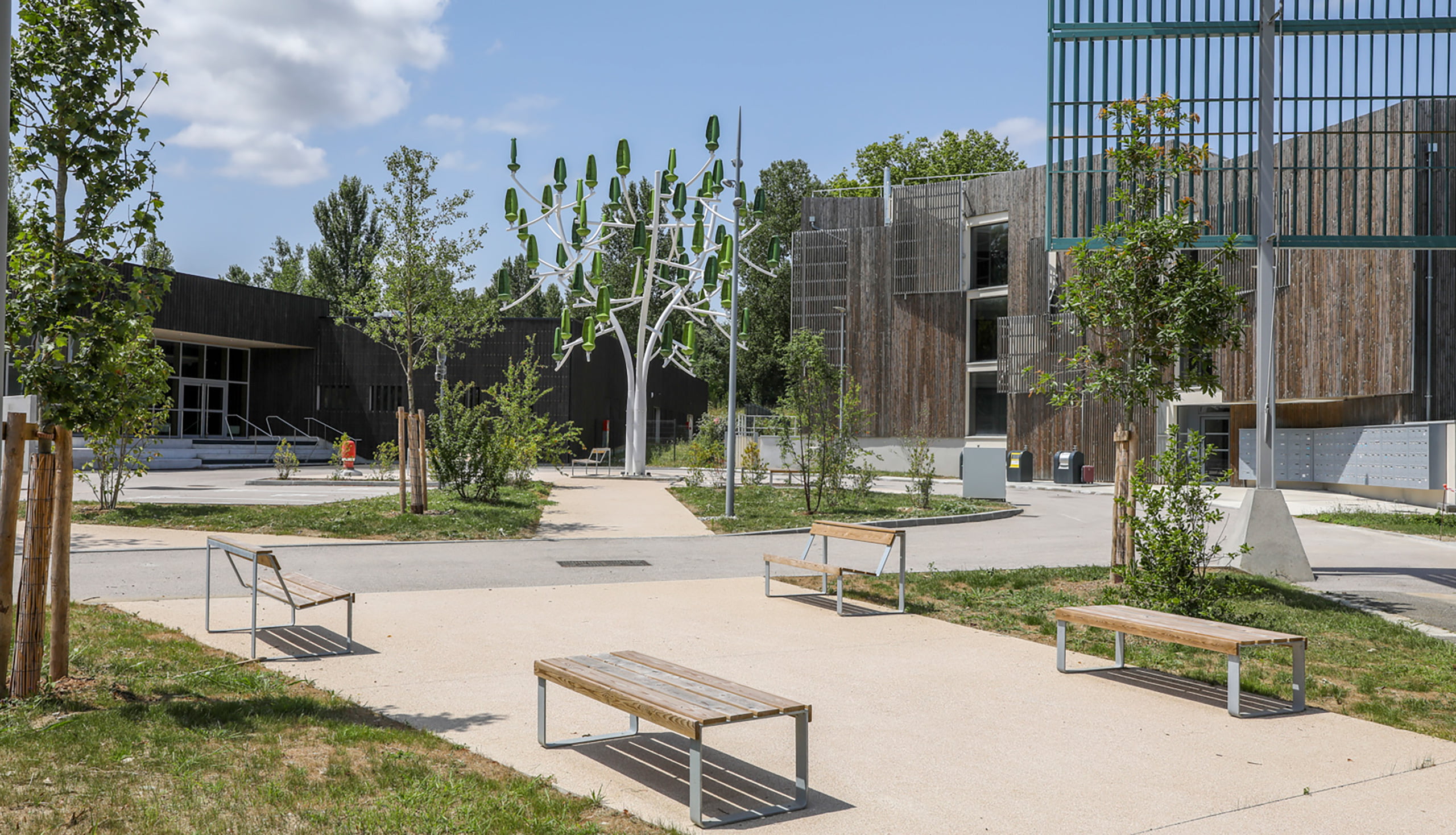 L’objectif premier du réaménagement du campus est de retrouver des espaces praticables pour les élèves, tout en respectant le budget. Pour ce faire, les circulations du campus ont été modifiées pour différencier les espaces dédiés à la voiture et ceux pour les élèves. L’artère principale utilisée par les véhicules est devenue une grande allée, longée de lieux de rencontres. En bout de perspective, un arbre à vent crée de l’énergie verte et envoie un message fort aux étudiants. Les stationnements ont été réorganisés et complétés par des parkings perméables végétalisés. Les nombreuses plantations structurent la nouvelle organisation et créent de l’ombre pour nouveaux usages.