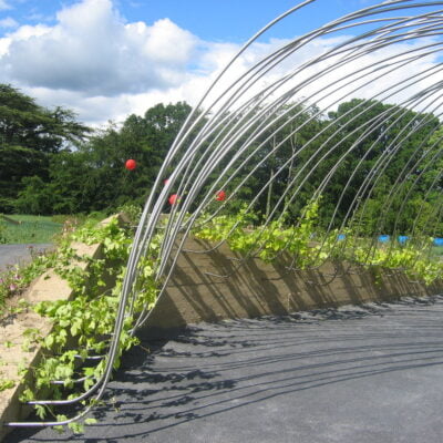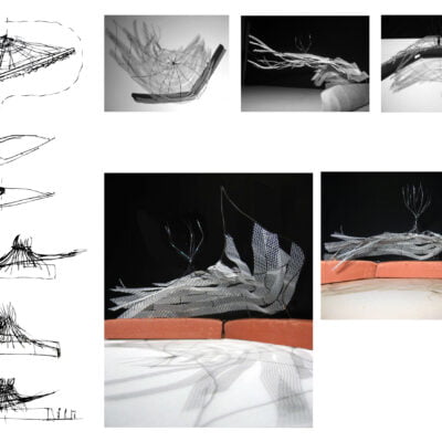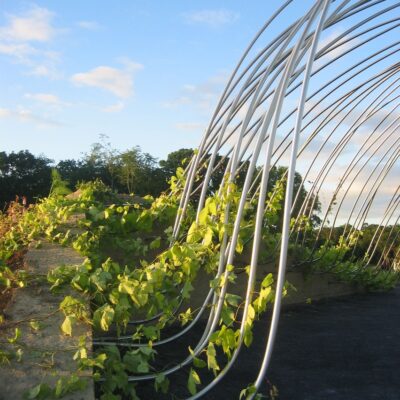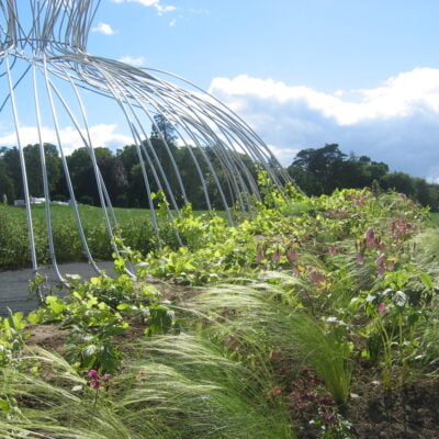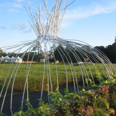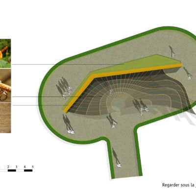 La thématique de l’année, Racine, nous a inspiré, nous voulions regarder « sous la jupe de la terre ». Soulever la jupe de la terre et y découvrir ses racines et les mystères du sous-sol. La métaphore étant posée, le jardin se compose donc d’un mur en pisé par lequel des racines sortes. Les tubes en inox symbolisent les racines pour former une robe et servir de pergola. Cette robe de bal se recouvre de plantes grimpantes aux fleurs colorées.
