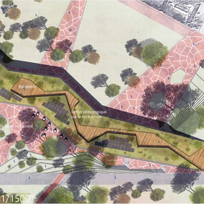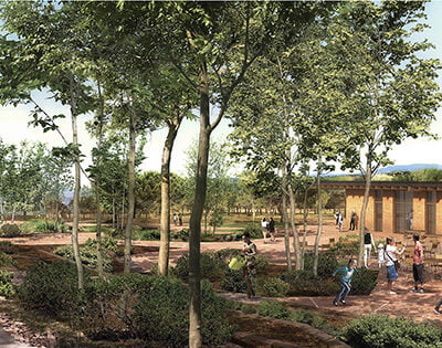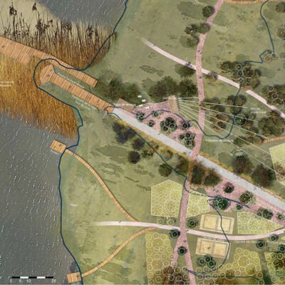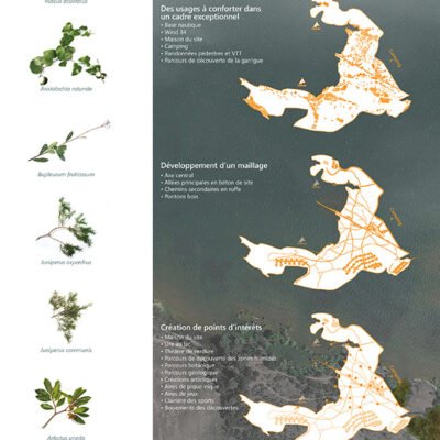 Les plantations par typologies : bosquet, lisière, boisement, arbre isolé, organisent les circulations et jouent des perspectives sur le paysage. Les allées se diffusent dans le site pour découvrir les usages et les points de vous sur le lac. Les stationnements s’insèrent dans les clairières pour avoir l’impact visuel le plus faible. La palette végétale reprend celle des paysages marquant le territoire et accompagne les promenades.