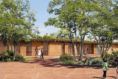 Le grand site du Salagou est un site exceptionnel. Le concours consistait à réorganiser le fonctionnement du site, d’intégrer les stationnements et de créer le pôle d’accueil. L’ancienne départementale, supprimée lors de la création de la retenue artificielle, structure le paysage. Le choix de l’implantation du pôle d’accueil a été d’ouvrir une perspective vers le lac et de profiter de la dénivellation pour insérer la construction et ainsi rendre la toiture terrasse accessible pour servir de belvédère.