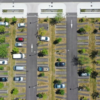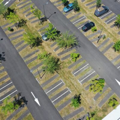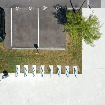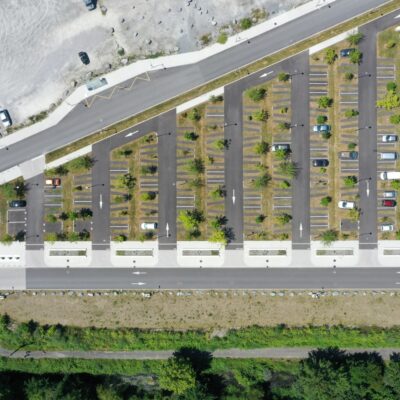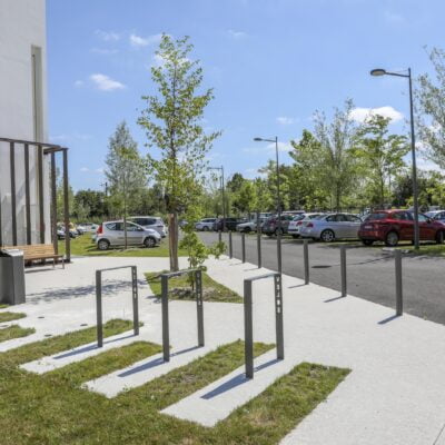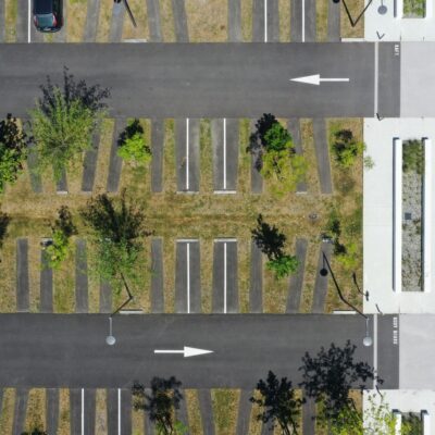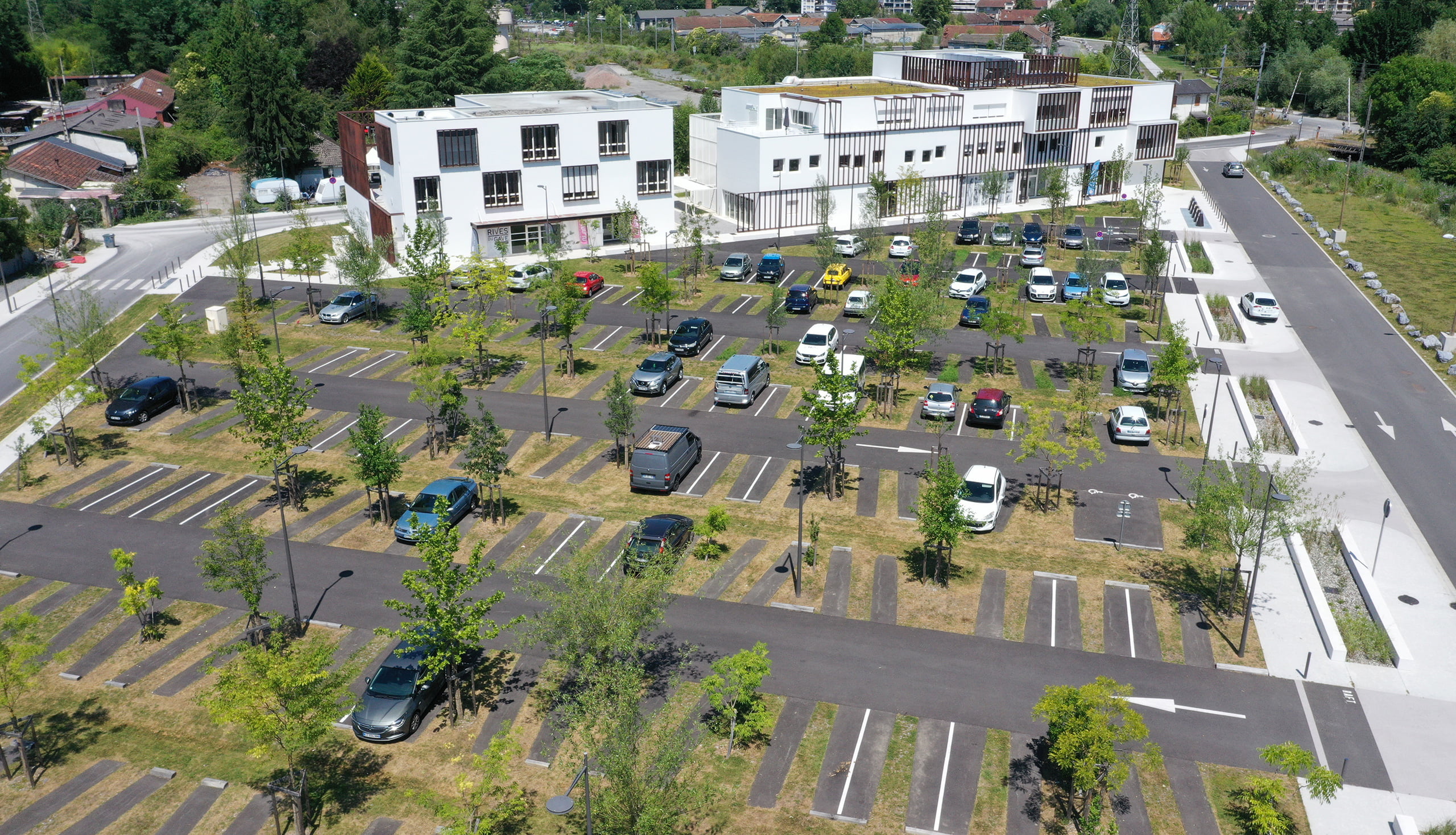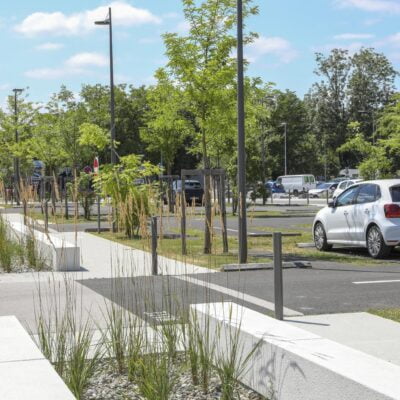 Le projet pourrait être de réaliser un simple parking. Pourtant, notre attachement au projet et nos convictions nous amènent à proposer un parking paysager. Les plantations viennent perturber les places de stationnement jusqu’à leur propre sens et pour laisser la part belle aux arbres. Les surfaces engazonnées sont optimisées et l’ensemble des eaux pluviales sont, soit infiltrées, soit recueillies dans les noues puis stockées. Un canal surmonté de banquette en béton vient structurer l’espace et servir de tampon pour les eaux pluviales.