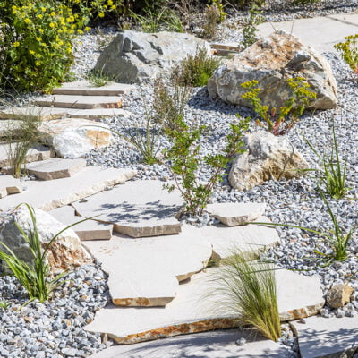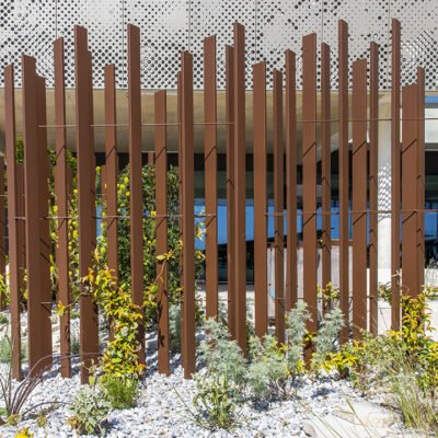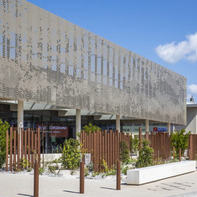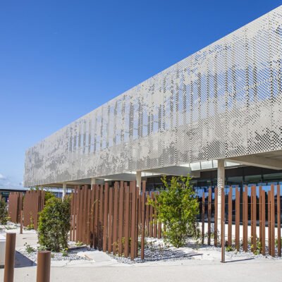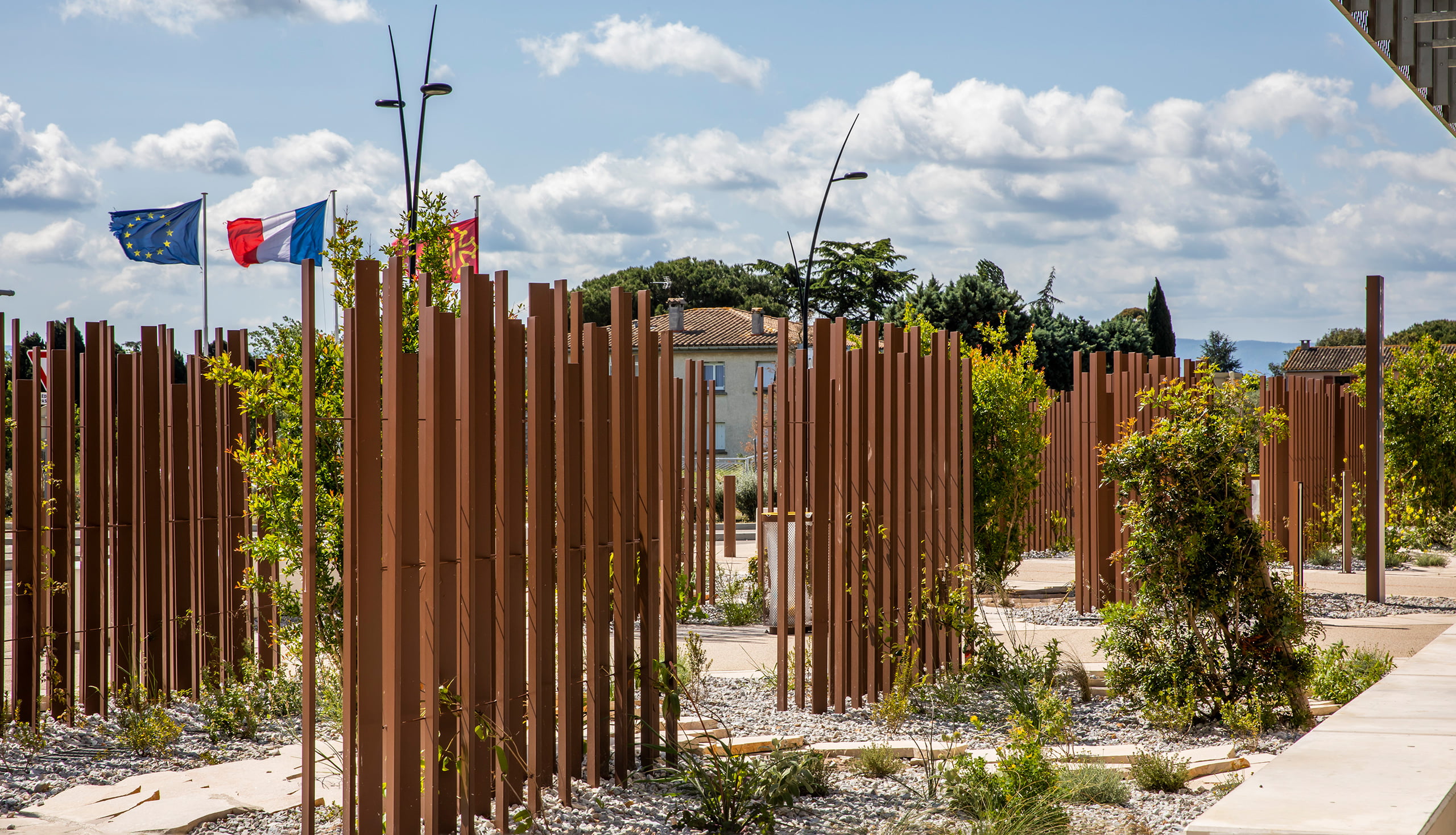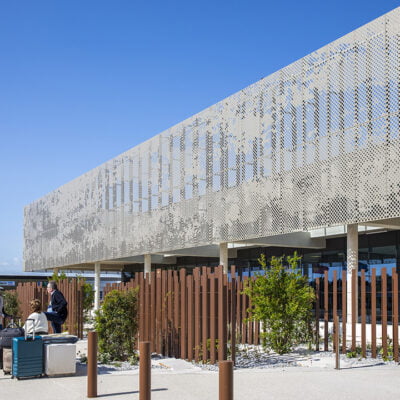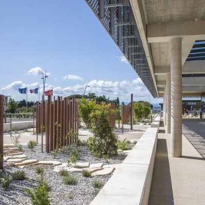 Les aéroports sont toujours une vitrine pour les paysages d’une région. Nous voulions que l’espace et le parvis de la nouvelle jetée au croisement avec l’entrée principale de l’aéroport, soit un aménagement retraçant le paysage ancré sur le territoire : la garrigue. La pierre calcaire et les plantes persistantes résignées et adaptées au terrain sec créent un paysage emblématique ; le jeu de surface minérale, de bloc rocheux et de végétaux reprend ces codes. Le vent, autre phénomène bien connu de la région est géré avec un système de pare-vent métallique venant à la verticale créer un jeu de filtre et de brise vent plantés.