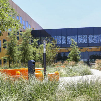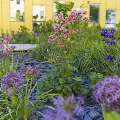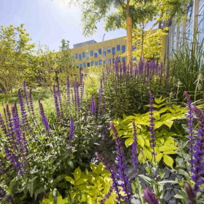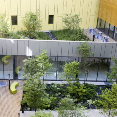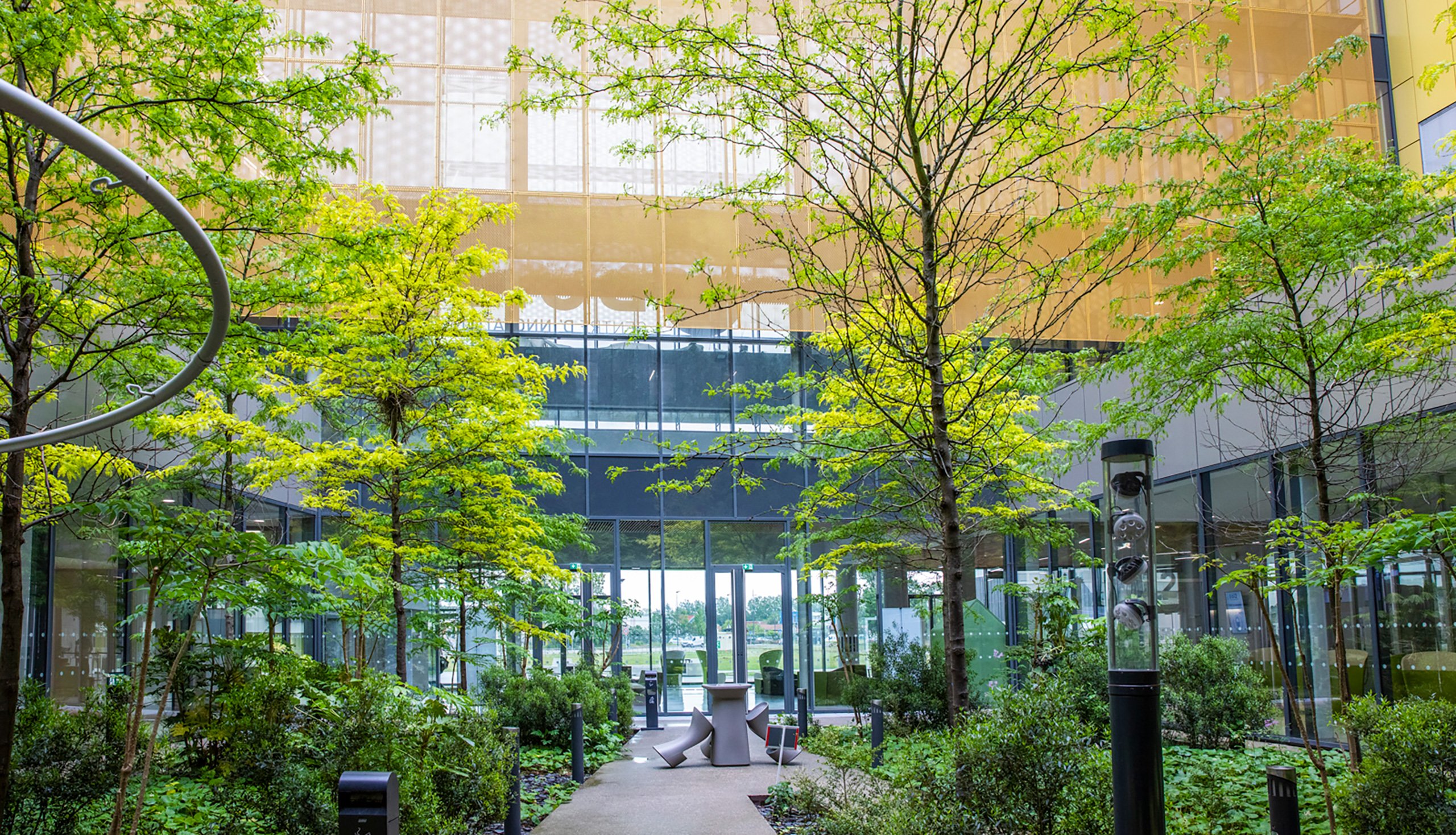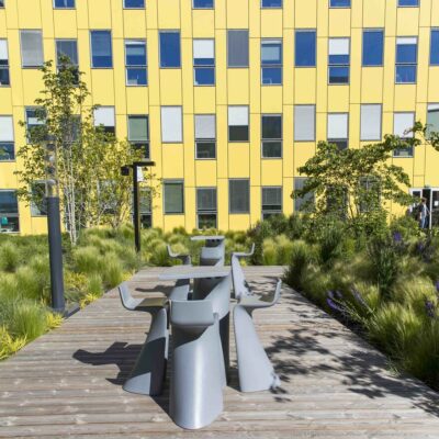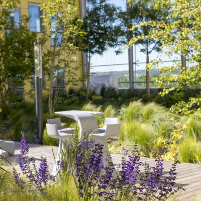 Aux étages intermédiaires, deux jardins terrasses, plantés d’arbres, de cépées et de plantes vivaces, développent une palette de couleurs en écho avec celles des façades. Les bureaux des étages et ceux attenants bénéficient de ces jardins pour venir faire une pause ou travailler sur les terrasses aménagées en bois. Les ondulations des plantations s’adaptent en fonction des besoins des végétaux et offrent un jeu de mouvement dans les jardins.