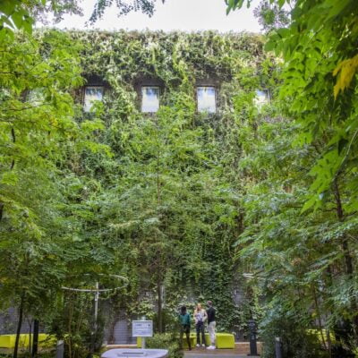 Le projet se compose d’un patio où la plantation d’arbres à petites feuilles laissent passer la lumière au bénéfice de plantes vivaces adaptées à l’ombre, jouant des textures et des camaïeux de verts. Au fond de ce patio, une maille métallique supporte sur une hauteur de 24 m une palette de plantes grimpantes, venant créer un décor sur toute la hauteur en fond de patio.