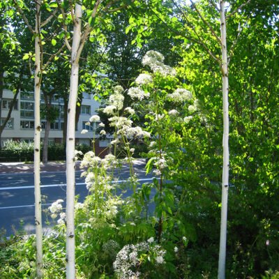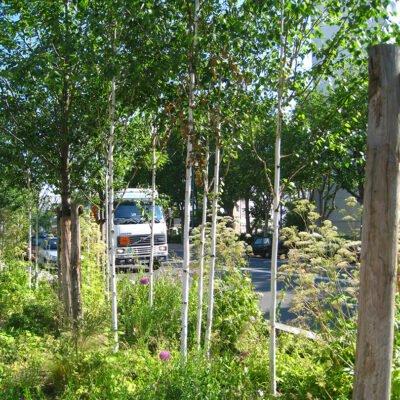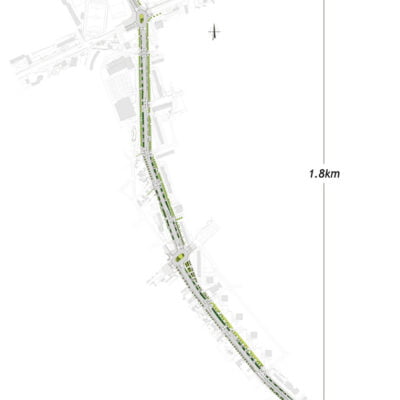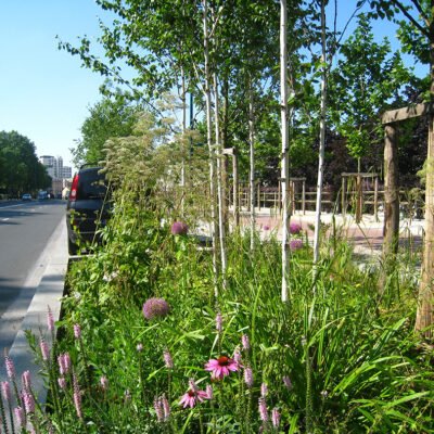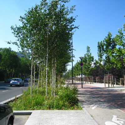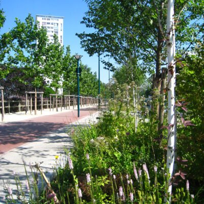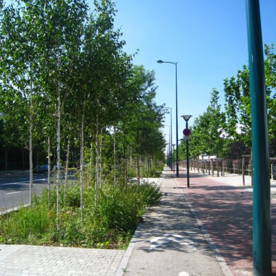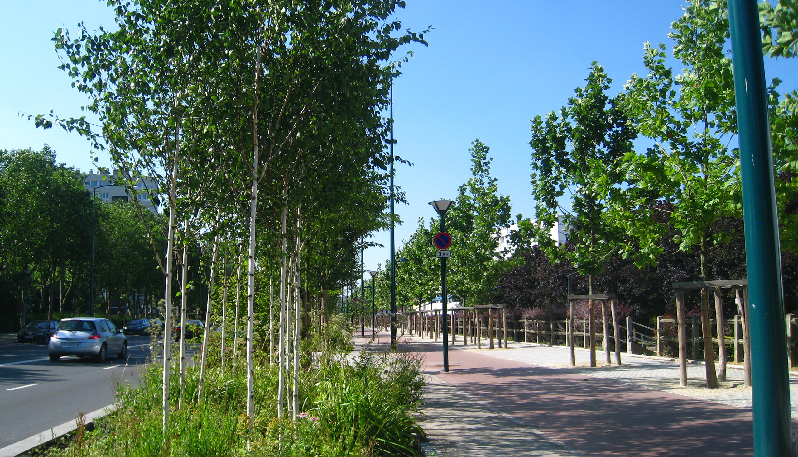 Le projet d’aménagement vient dans le cadre du prolongement de la ligne 13 du métro. Dans cette perspectives, l’ensemble de la RD 19 est restructurée et vient accueillir trois stations de métros. Le projet d’aménagement a consisté à définir des séquences paysagères et à planter densément un seul côté. Les ilots arborés sont plantés de 1600 bouleaux et de massifs de vivaces à leurs pieds. Ces ilots de biodiversité accompagnent les modes doux, comme la piste cyclable ou les trottoirs. Ponctuellement des poches de stationnement composés de deux places évitent aux camions de stationner. Les stations de métro sont plantées d’arbres remarquables comme des Gingko ou d’autres essences horticoles.