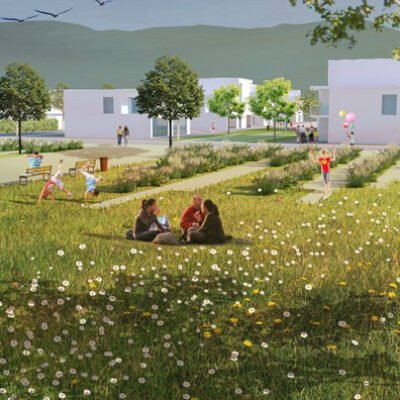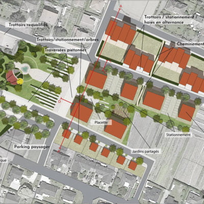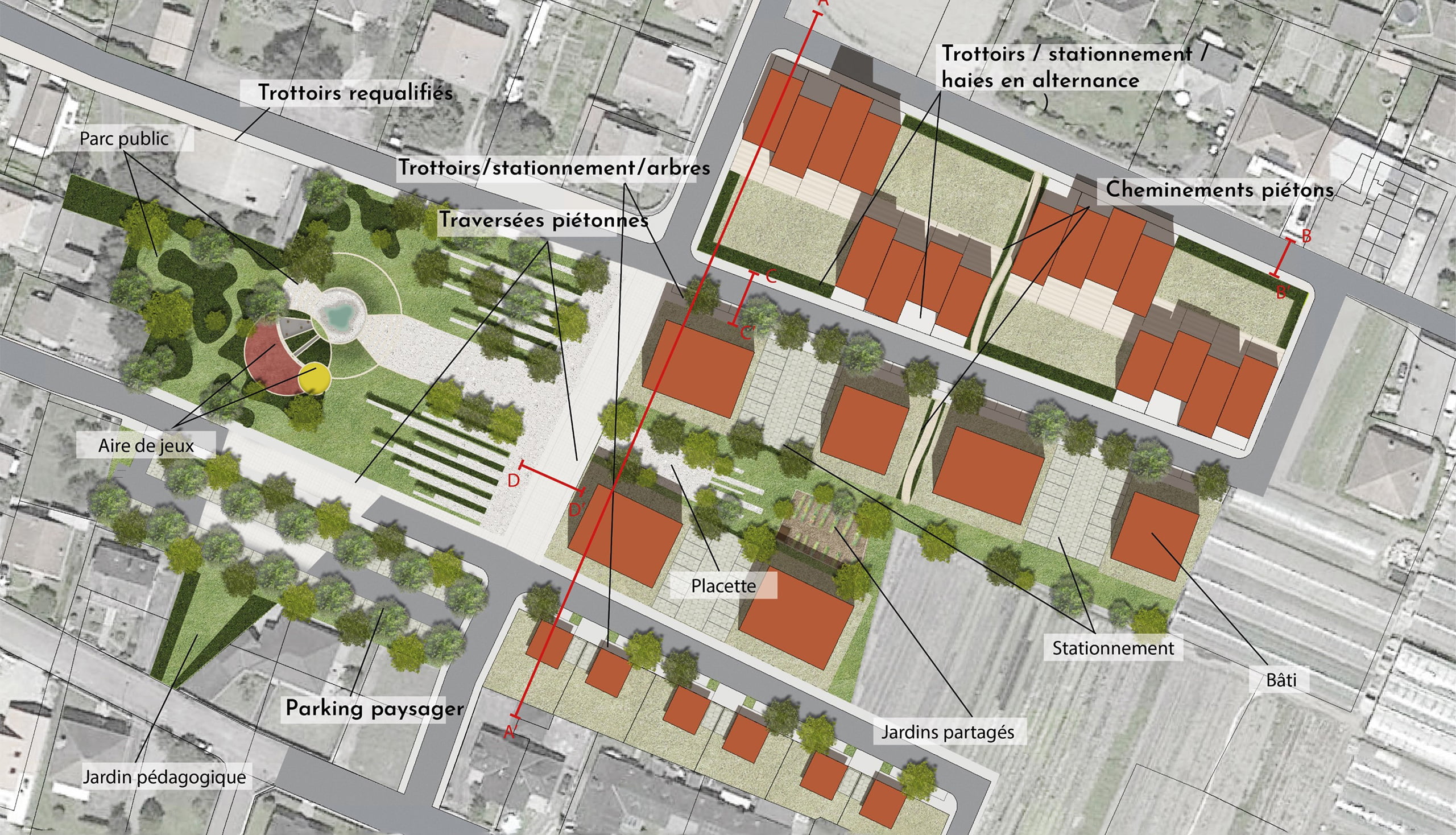 L’urbanisation du quartier est basée sur la création d’un maillage de voies, raccordées aux rues existantes. Ces voies permettent de desservir des ilots d’habitations, avec des formes urbaines mixtes, permettant une mixité sociale et une diversité de l’offre répondant à la demande lourdaise. Le traitement paysager des espaces publics est un des principaux points d’entrée pour l’aménagement du quartier : rues arborées, bordures des jardins privatifs plantés, espaces publics (dont aire publique de stationnement) végétalisés, vues sur le grand paysage dégagées… L’objectif est de proposer un quartier qualitatif, bien intégré dans son environnement. Le point d’accroche du quartier est symbolisé par l’aménagement d’un espace public structurant, ayant pour but de répondre aux besoins des habitants d’un large périmètre, au-delà du quartier en lui-même. Ce parc permet également la récupération et infiltration des eaux de pluie. Le projet est conçu pour répondre au label Ecoquartier.
